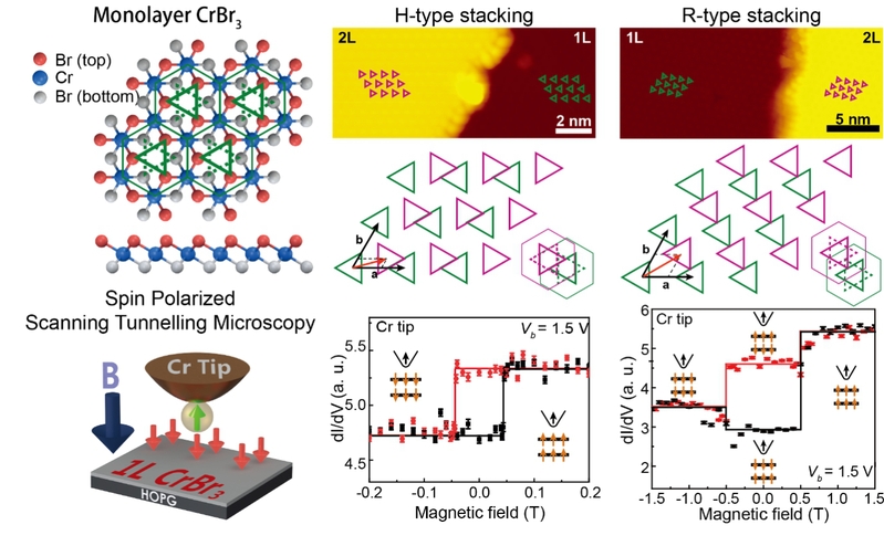 A group led by Prof. Chunlei Gao, in collaboration with Prof. Shiwei Wu and Prof.Xiaodong Xu, recently found that the bilayer CrBr3 grown by molecular beam epitaxy (MBE) has two kinds of stacking order with different layer twisting angles: R-type stacking structure, where the adjacent layers are oriented in the same direction, and H-type stacking structure, where the adjacent layers are oriented in the opposite direction. By employing the home-built state-of-the-art spin-polarized scanning tunnelling microscope, they established a direct correlation between stacking order and interlayer magnetic coupling. The result has been published in Science entitled “Direct observation of van der Waals stacking dependent interlayer magnetism” on November 22.