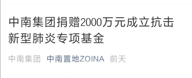 Zhongnan Group donated 20 million yuan ($2,866,561) to aid the people in virus-stricken areas and purchase medical supplies for the medical workers fighting in Wuhan.