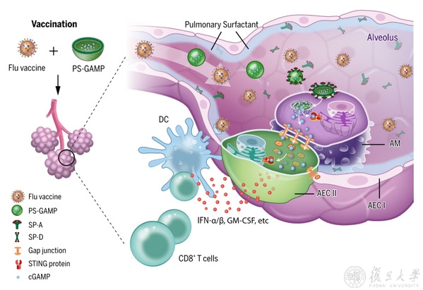 The researchers synthesized pulmonary surfactant (PS) – biomimetic liposomes encapsulating 2′,3′-cyclic guanosine monophosphate–adenosine monophosphate (cGAMP) to simulate influenza viral infection. They found PS-GAMP escaped immune surveillance after intranasal immunization, activating the STING pathway in both AMs and AECs without breaching PS and alveolar epithelial barriers. Through this mechanism, cGAMP promotes effective humoral and CD8+ T cell protective immune responses to resist the attack of heterogeneous influenza viruses. The study sheds light on the pivotal role AECs play in generating broad cross-protection against various influenza viruses. Thus, PS-GAMP is a promising mucosal adjuvant for “universal” influenza vaccines.