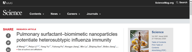 On Feb. 21, the research article titled “Pulmonary surfactant–biomimetic nanoparticles potentiate heterosubtypic influenza immunity” by the research teams led by Lu Lu and Jiang Shibo from the School of Basic Medical Sciences, Fudan University and Mei X. Wu from Massachusetts General Hospital of Harvard Medical School, was published in Science. Their findings reveal the function and mechanism of biomimetic nanoparticles as a mucosal adjuvant for universal influenza vaccines.