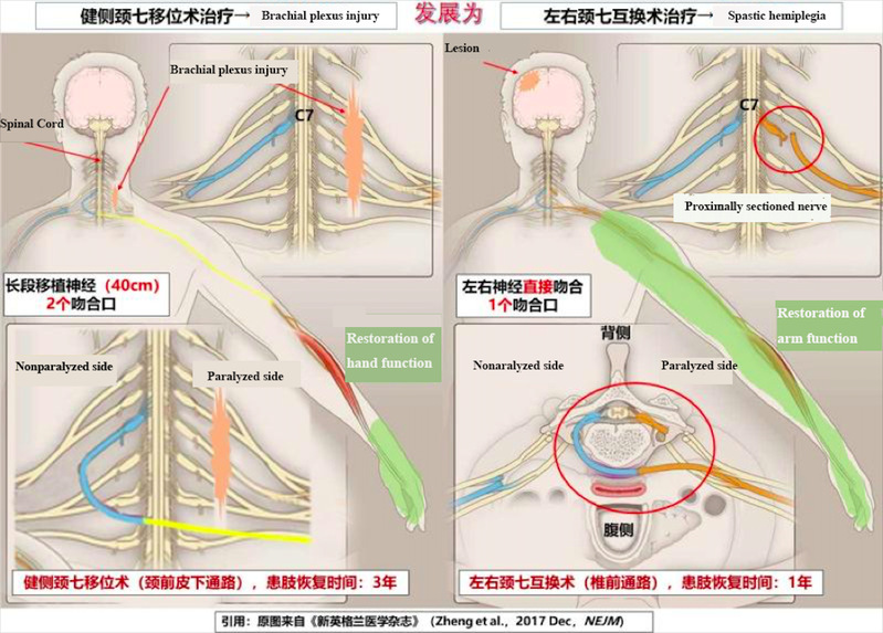 C7 transfer surgeries for treating unilateral arm paralysis due to brachial plexus injury (left) and brain injury (right)