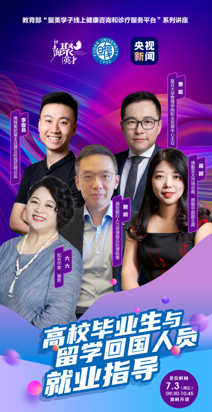 On July 3, Fudan University and Shanghai Human Resources Service Center invited six guest speakers from different industries to provide career guidance for graduates and overseas returnee students. The event was held as a part of the lecture series designed by Fudan University for all Chinese students studying in the U.S. in the shock of coronavirus across the globe. The lecture was moderated by China Central Television (CCTV) host Lv Xiaojun and live-streamed on CCTV app.