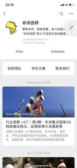 The homepage of WeChat account 非洲咨研 run by Yunong and her friends.
