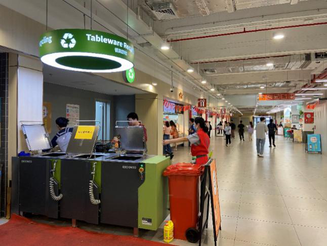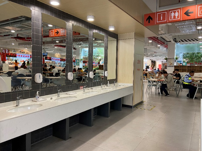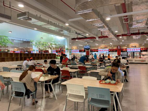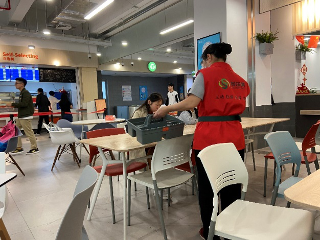 Thanks to the glass roof, you can enjoy plenty of sunshine at the canteen. Cleaning staff come to clean the tables immediately after students finish their meals, and the intelligent recycling system shall turn the kitchen waste into carbon dioxide and water by degrading the microbes in the food waste.