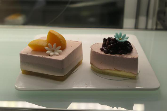 Mousse cakes topped with mango and berries (Average price per cake: RMB 15)