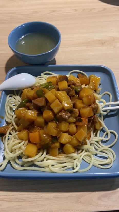 Xinjiang (halal) noodles with diced potatoes and carrots (Average price per dish: RMB 12)