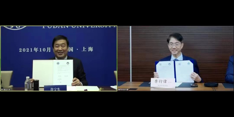 On behalf of Fudan University, President Xu Ningsheng met with the heads of the University of Hong Kong (HKU), the Chinese University of Hong Kong (CUHK), the Hong Kong University of Science and Technology (HKUST), University of Macau (UM) and Macau University of Science and Technology (MUST) via video links during the 19th Annual Presidents’ Meeting on Building World-Class Universities. Xu also signed cooperation agreements online with the heads of UM, MUST and HKU on October 14-15.