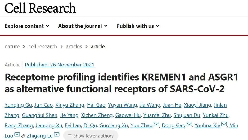 The research article entitled “Receptome profiling identifies KREMEN1 and ASGR1 as alternative functional receptors of SARS-CoV-2” has been published in Cell Research.