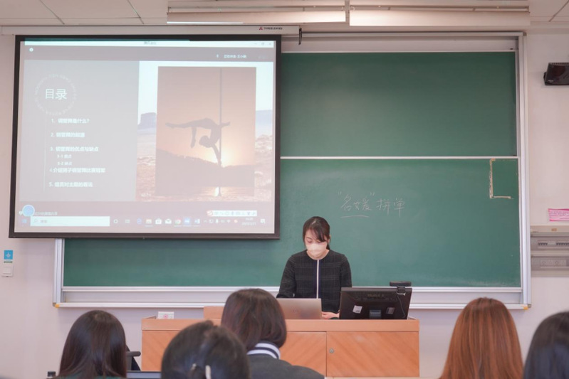 A student is giving a presentation on pole dance.