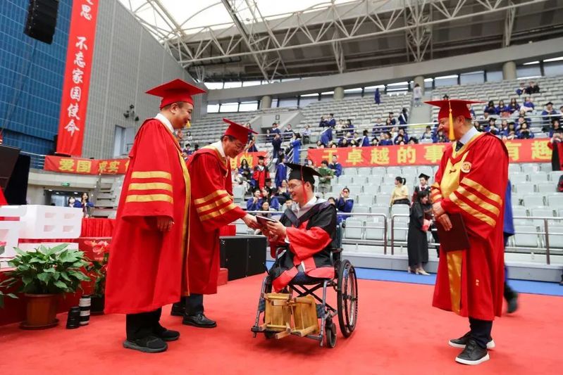 Zheng Zhiyuan, a PhD candidate from the School of Mathematical Sciences, was wheeled to the center of the stage. Despite the physical challenges and inconveniences brought about by his upper limb amputation, Zheng Zhiyuan’s passion for knowledge never once diminished. After some 2,000 days and nights of hard work, the university proudly conferred him the doctoral degree. When he held up the graduation certificate, applause and cheers erupted from the audience.